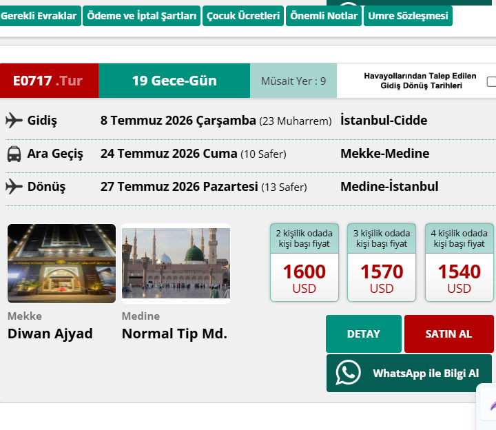 E 0717 / UMRE PROGRAMI 19 GECE – 20 GÜN GİDİŞ : 8 TEMMUZ 2026 / DÖNÜŞ : 27 TEMMUZ 2026