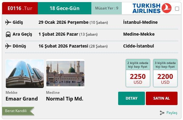 E0116 / İK UMRE BERAT KANDİLİ 19 GÜN 600MT. 4* EMAAR GRAND HOTEL YÜRÜME MESAFE 29 OCAK 2026 GİDİŞ 16 ŞUBAT 2026 DÖNÜŞ