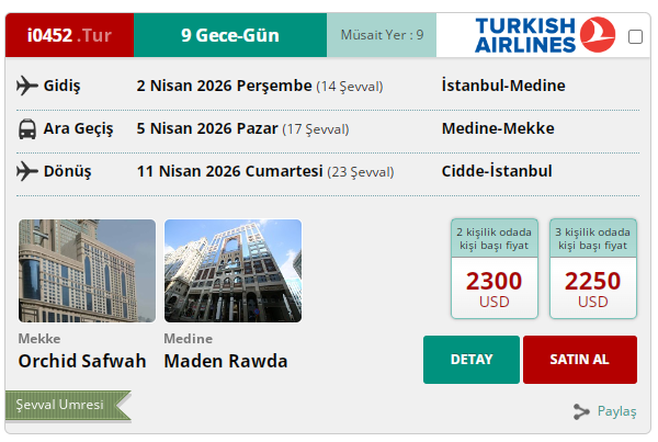 İ0452 İK/ UMRE ŞEVVAL10 GÜN 50 MT. 5* ORCHİD SAFWAH HOTEL YAKIN MESAFE 2 NİSAN 2026 GİDİŞ 11 NİSAN 2026 DÖNÜŞ