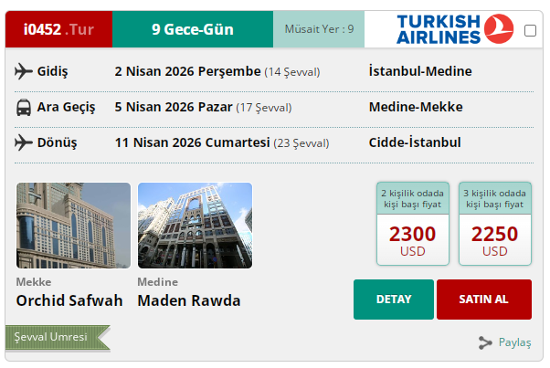 İ0452 İK/ UMRE ŞEVVAL10 GÜN 50 MT. 5* ORCHİD SAFWAH HOTEL YAKIN MESAFE 2 NİSAN 2026 GİDİŞ 11 NİSAN 2026 DÖNÜŞ